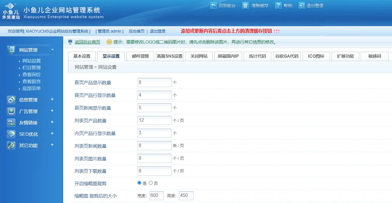 显示设置:网站首页及内页的产品、新闻。下载的显示内容数量设置