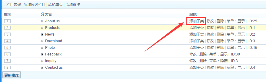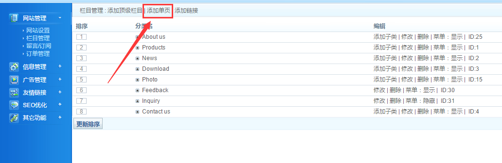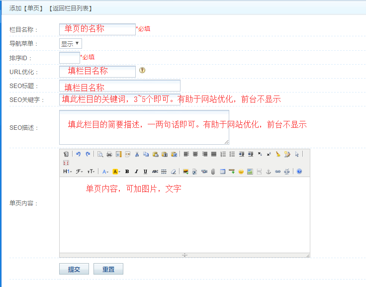注:顶级栏目是单页模型,二级、三级栏目必须是单页模型。