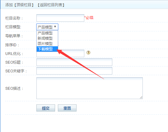 下载模型:即添加下载的栏目模型,比如Download栏目