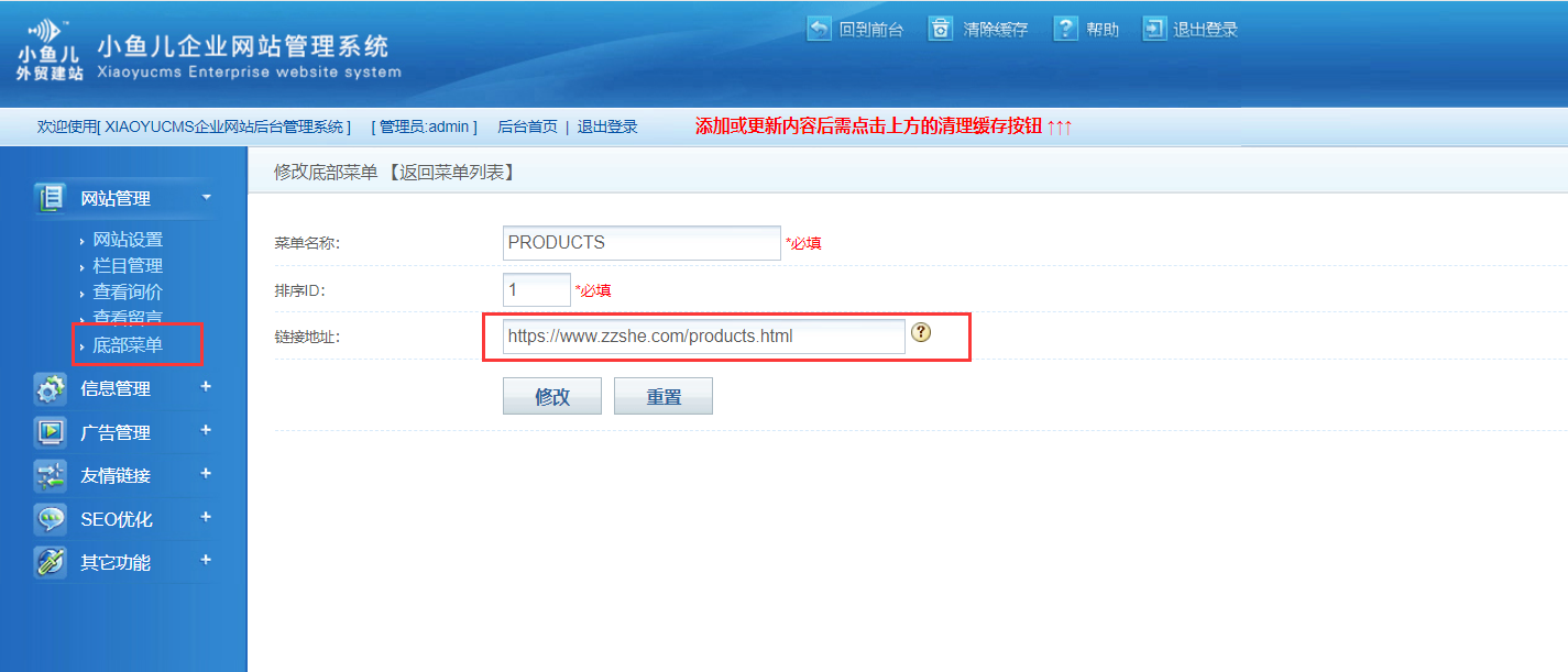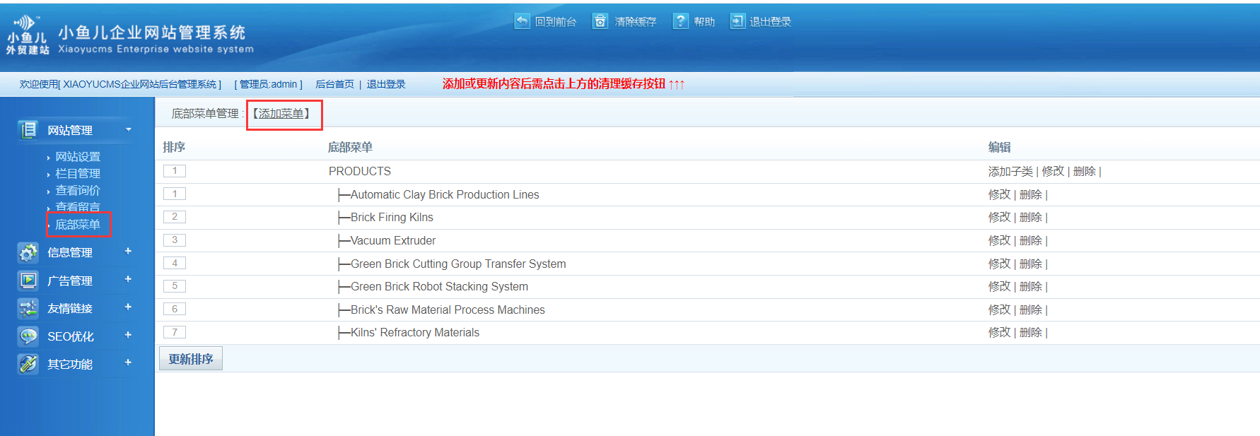 底部菜单:添加底部菜单,在前台底部即会出现(并不是每个风格都有底部菜单,因选的风格而异)