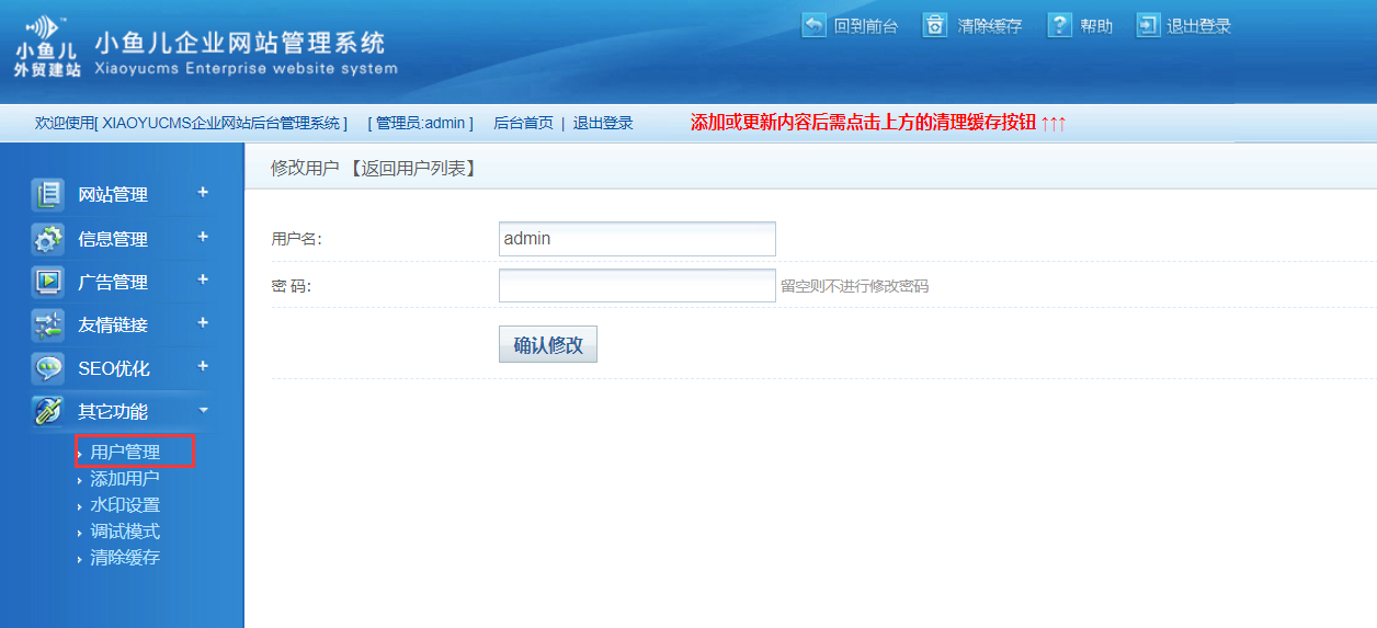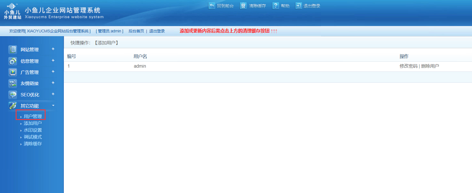 用户管理:即添加后台登录的用户名和密码(可添加多个用户),客户可同时登录添加内容。