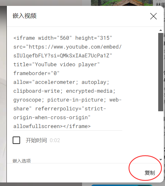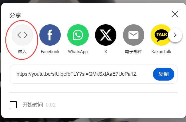 1.打开youtobe视频,点击分享>嵌入>复制代码